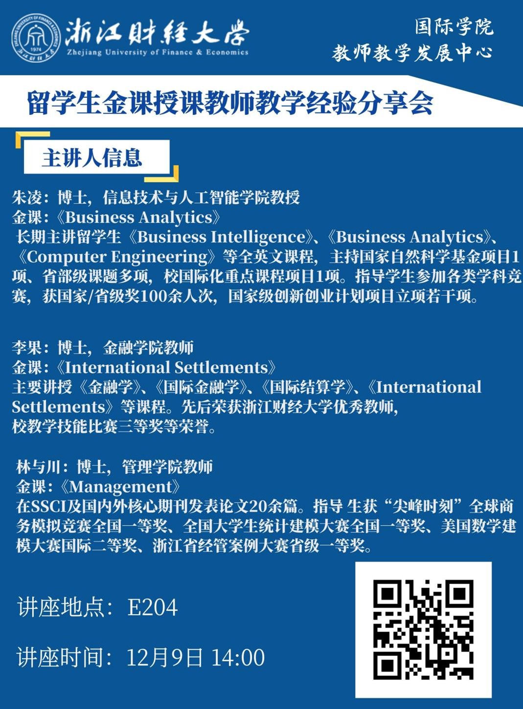 讲座预告——留学生金课授课教师教学经验分享会 发布时间:2025-12-03 点击量:次 时间:12月9日 14:00 地点:E204教室 参加对象: 首次担任留学生课程的任课教师 欢迎其他感兴趣的教师参加 参加的老师请扫海报上的二维码报名 教师教学发展中心、国际学院 2025年12月3日 下一条:关于组织师生参加中国经济大讲堂第四讲线上培训的通知